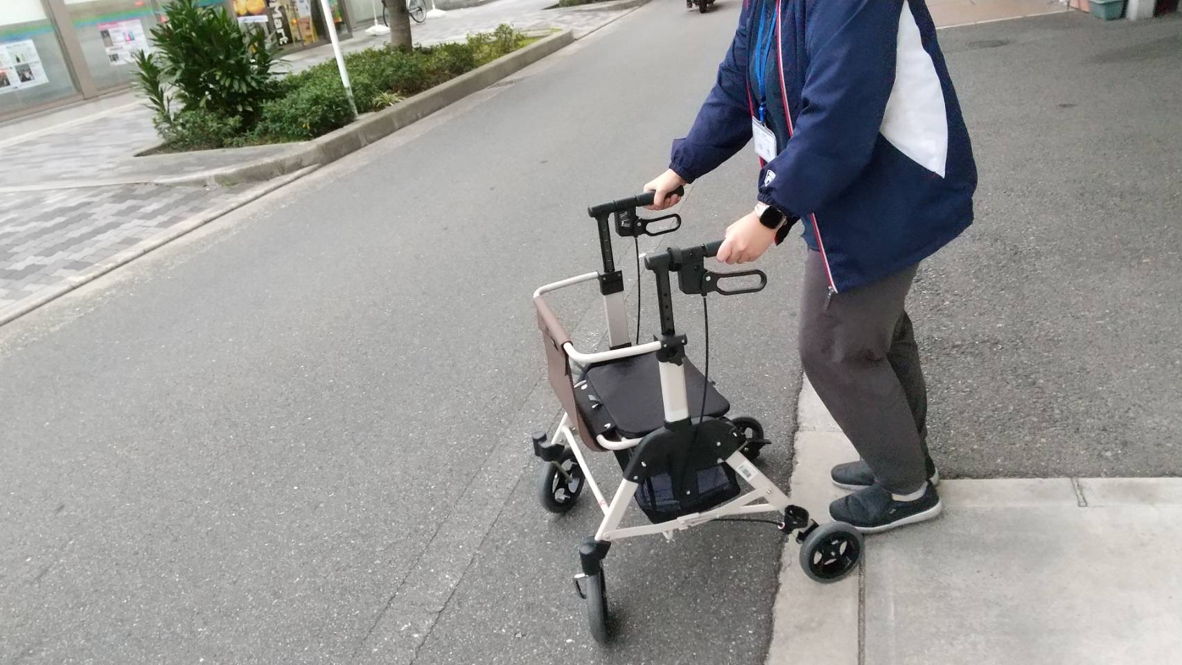 先日、歩行器の体験会に参加致しました。今回の歩行器は買い物カゴを歩行器に乗せることができ、歩行器から買い物カートへ持ち替える必要がなく、レジ台へも移しやすい高さとなっております。