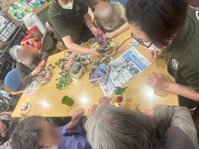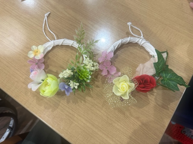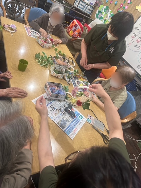 わか北加賀屋では各季節ごとに手芸クラブをさせて頂いております。 手芸クラブの参加は任意で女性のご利用者様にはとても人気があります。 男性のご利用者様でも奥様にプレゼントするために参加される方も多くいらっしゃいます。 この1週間はお花のリースを作成中です。玄関やお部屋のドアノブに飾ってくださる方が多いです。